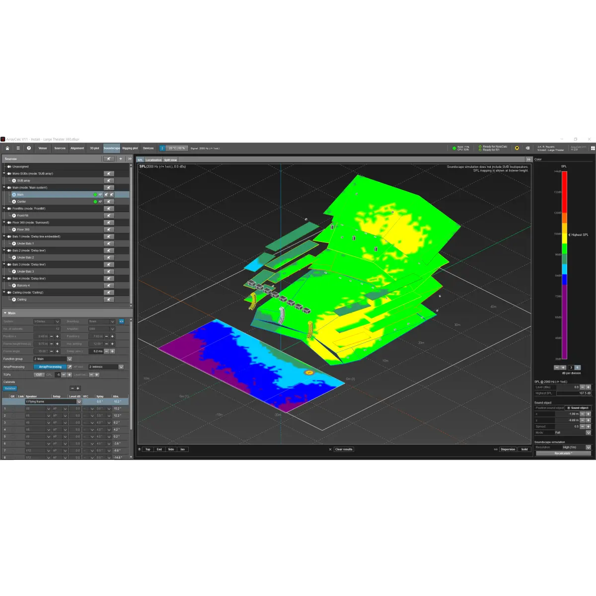 - ArrayCalc: Samotný návrh systému začíná procesem výběru reproboxů, jejich umístěním, predikcí a optimalizací. Point sources reproboxy, line array reproboxy i Subwoofery lze navrhnout pro dosažení maximálního výkonu s vyrovnanou frekvencí a rovnoměrným rozložením tlaku po celé poslechové ploše.